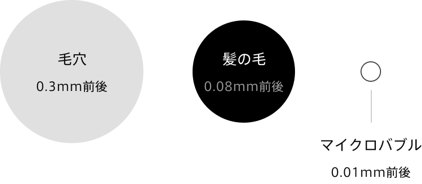 0.01mm前後のマイクロバブルのきめ細かい濃密な泡がムラなく広がり、浸透。繊細な泡が髪一本一本に吸着し、成分が深部まで浸透します。